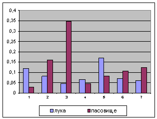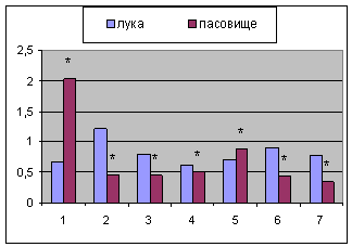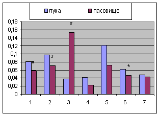 тенденція –показник в мотлосі вищий на пасовищі, ніж на луці (рис. 1, Б).