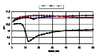гидролиз и гидратация. Величина рН суспензий растет и через один час гидратации