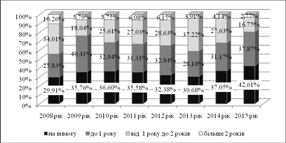 депозитів, залучених банками України, виходячи з класифікації строковості.