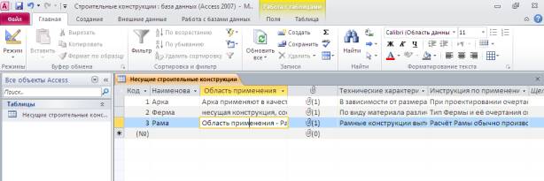 предметная область – Строительные конструкции, определены главные таблицы, а