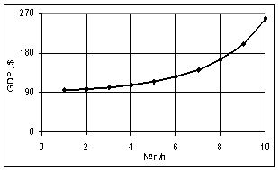 Х2 = Х3 = Х5 = Х6 = 1…10, Х4 = 0,1…1. В этом случае значения GDP увеличиваются в 7,18 раза.
