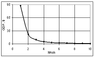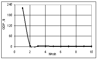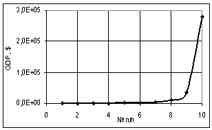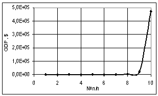зависимость при Х1 = Х2 = Х3 = Х4 = 1, Х5 = 1…10, Х6 = 0,1…1. В этом примере значения GDP уменьшаются в 100 раз.