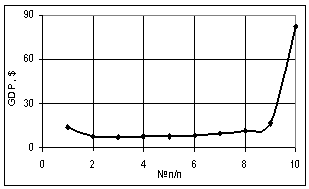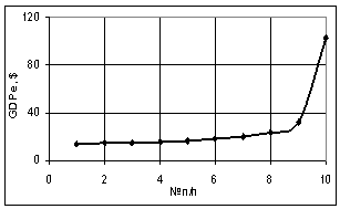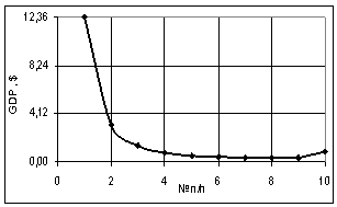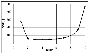 увеличивается в 11,15 раз до значения 474,54 в точке 10. Представленная кривая GDP на рис. 12 также имеет минимум в точке 2, где GDP =
