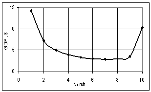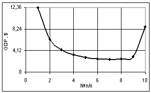 получаем опять кривую с ярко выраженным минимумом в точке 7 со значением GDP = 2,44 после чего они увеличиваются более чем в три