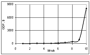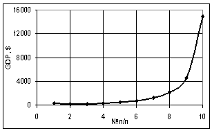 162,05, после чего увеличивается значительно до величины GDP = 14973,34 в точке 10, т.е. ее значения увеличились в
