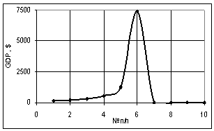 величины GDP = 7403,09, после чего падают до нуля в точке 7. На рис. 14