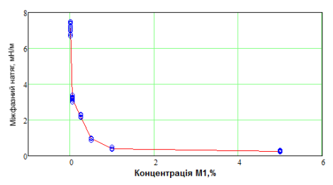 показано вплив концентрації М1 на коефіцієнт міжфазного натягу на границі розділу фаз «нафта» –