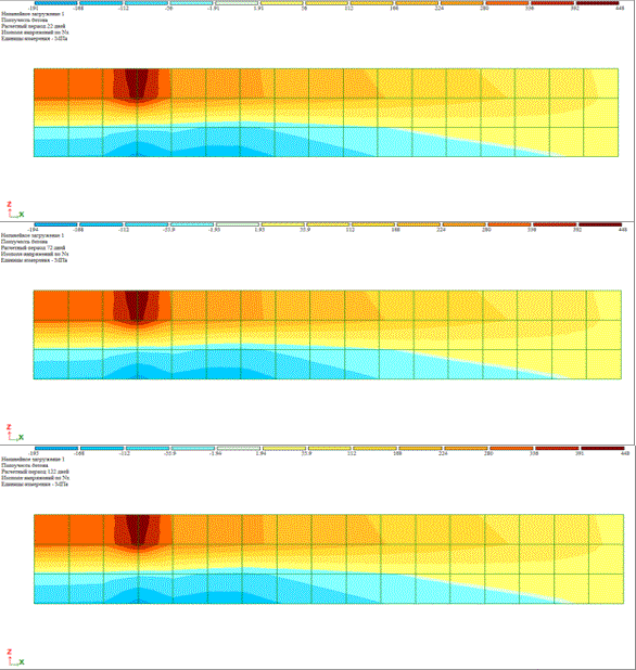Рис. 3. Изополя напряжений по Nх c учетом ползучести в разные периоды.