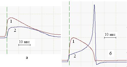осциллограммы напряжения (кривые 1) и тока (кривые 2) высоковольтного разряда в