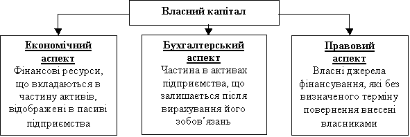 На нашу думку, поняття власний капітал необхідно розглядати двобічно. З одного боку власний капітал – це засоби у їх грошовій, матеріальній і нематеріальній формах, інвестовані у формування активів підприємства. З іншого боку, в результаті ефективної діяльності підприємство отримує доходи у формі нерозподіленого прибутку, сум дооцінки необоротних активів, а також додатково вкладений капітал. Капітал має юридичне і економічне значення. Юридичне значення капіталу полягає передусім в тому, що його розмір визначає межі мінімальної матеріальної відповідальності, які суб’єкт господарювання має за своїми зобов’язаннями. Економічна роль власного капіталу полягає в забезпеченні підприємства власними фінансовими ресурсами, необхідними як для початку, так і для продовження реальної господарської діяльності [3]. Розкриття сутності власного капіталу відображується у трьох найголовніших аспектах (рис.1.).