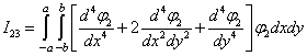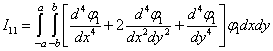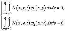 Помножив N(x, y, t) на координатные функции φ1(x, y), φ2(x, y) и проинтегрировав полученные выражение по площади плана оболочки [8], придем к системе уравнений