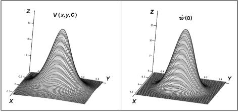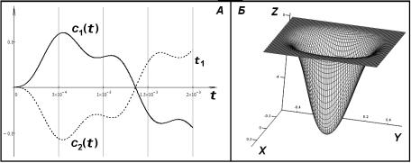 Рисунок 2 – Графики с1(t), с2(t) и w(x, y, t)