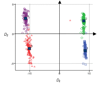 дискриминантные функции для 4 классов качества и центры групп