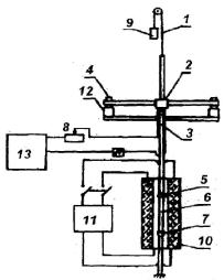 зажимы; 6 – образец; 8 – реостат; 9 – груз; 10 – печь; 11 – терморегулятор; 12