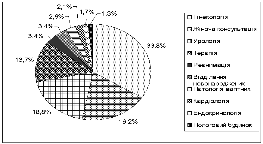 зразків було отримано з двох гінекологічних відділень – 33,8% (79), значну