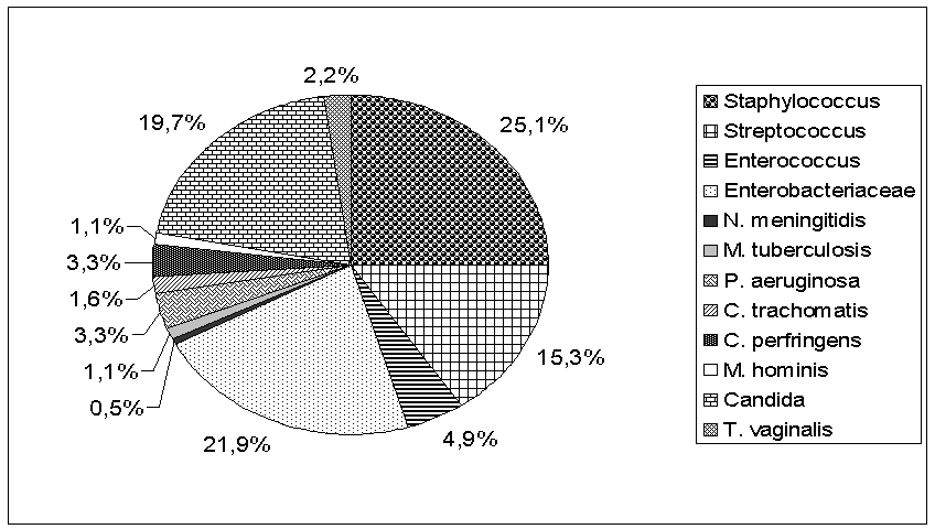 становила 18%, з них переважали види родини Enterobacteriaceae – 10% та дріжджі роду Candida – 4%. З представників ентеробактерій виявляли: Klebsiella