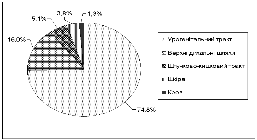 більшість були ізольовані з урогенітального тракту (УГТ) – 74,8% (175), з