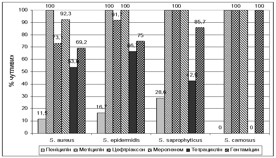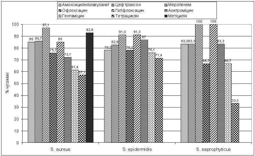 чутливі, та метіцилін – 92,9% чутливі. Для коагулазонегативних стафілококів