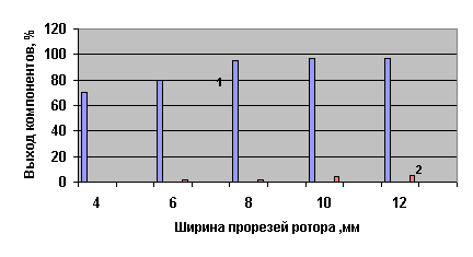 ширины прорезей ротора на степень экстракции ЖК (1) и посторонних примесей (2)