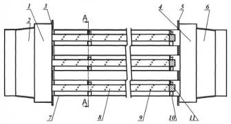 перфорированная стенка; 6 – выходной воздуховод; 7 – нагреваемая труба; 8 –