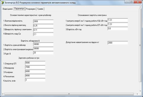 вікно, де задаються параметри складу, та вибір параметрів кран-штабелера,