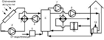 теплоприемного контура, нагреваясь в солнечных коллекторах 1, поступает в двухконтурный