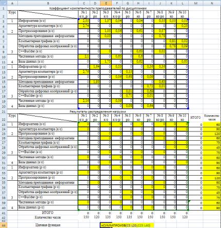значения ячеек С23:L40 >= 0, так как количество часов, отведенных на