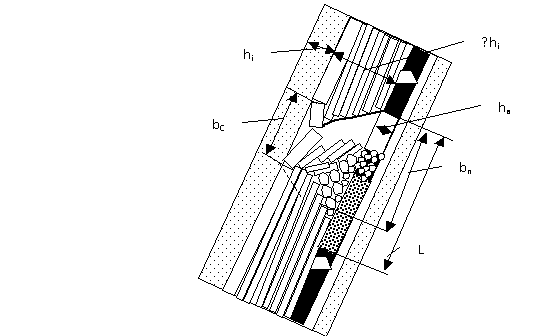 Fig. 2. Scheme of interaction of basic and immediate roof with steep seams ( section through the fall )There are several classifications of the roof coal seams demolition. By easily collapses rocks are mostly of the roof , in which the power of the immediate roof easily collapses more than 7 times the capacity of the reservoir , ie híê / m> 7, It destroyed hard - who híê ≤ 1m. When híê / m> 8-10 breed close the roof completely swelling main roof . With a relatively rigid support in the goaf , she collapses , but only bends .