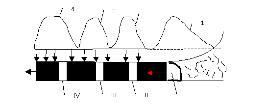 Fig. 3. Scheme of the wave-like symptoms bearing pressure front face of lava : 1 , 2 , 3, 4 - reference pressure curves in the roof ; I, II, III, IV - the position of the working face