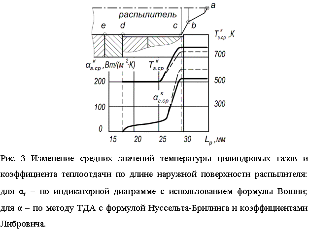 Из таблицы 1 видно, что значение эквивалентной температуры для обоих методов расчёта близки, расхождение составляет менее 4%. Значения среднего коэффициента теплоотдачи, полученных этими методами имеют значительный разброс. Так αг.ср по методу ТДА с формулой Нусельта-Бриллинга и коэффициентами Либровича больше чем по индикаторной диаграмме на 21%, а по методу ТДА с формулой Нусельта-Бриллинга и коэффициентами Трактовенко больше на 76%. Результаты последующих расчётов теплового состояния распылителя при сравнении с экспериментально измеренной температурой позволят установить наиболее точный метод определения граничных условий теплообмена распылителя с цилиндровыми газами.