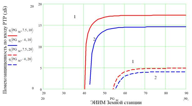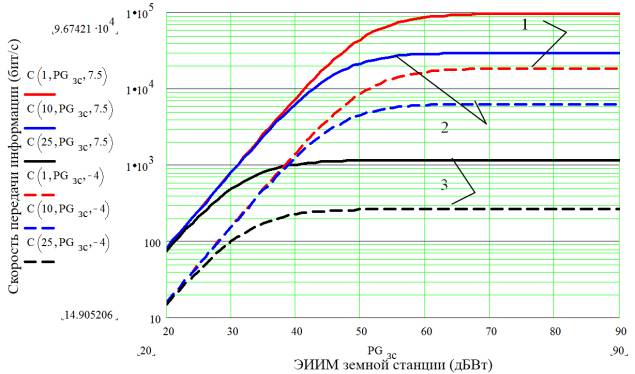 добротности приемной антенны средних ЗС Q = 7,5 дБ/К, а кривые 2 - добротности малых станций Q =