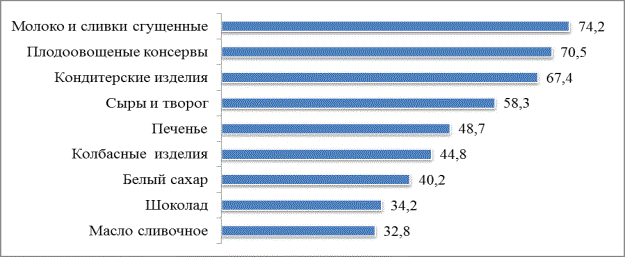 такие продукты, как сахар, включая сырец (31 %), растительное масло (13 %),