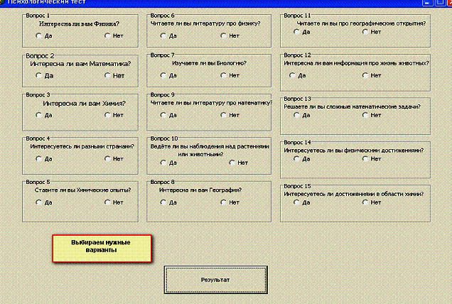 программа «Уточнение круга интересов личности». Для решения данного вопроса были выбраны тестовые вопросы на