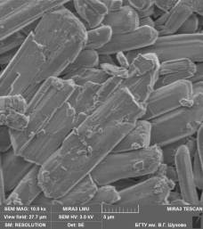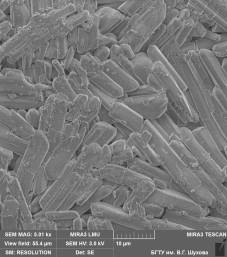 Рис. 2. Микроструктура синтезированного гипса. Увеличение: (а) 5 мкм; (б) 10 мкм.