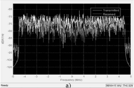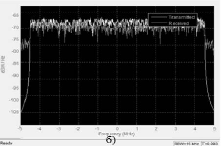 наведено графіки спектру переданого і отриманого сигналу із використанням вдосконаленого