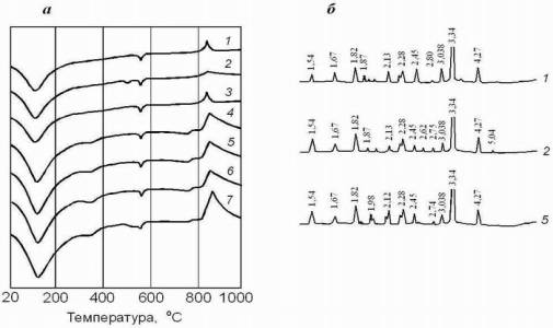 Рис. 1. Термограммы (а) и рентгенограммы (б) силикатных материалов: