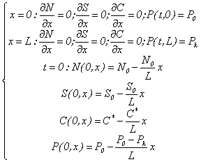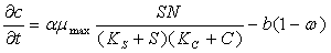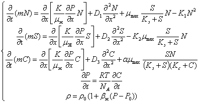 В первом уравнении системы концентрация микроорганизмов увеличивается во времени за счет размножения по модели Моно и одновременно с этим уменьшается за счет