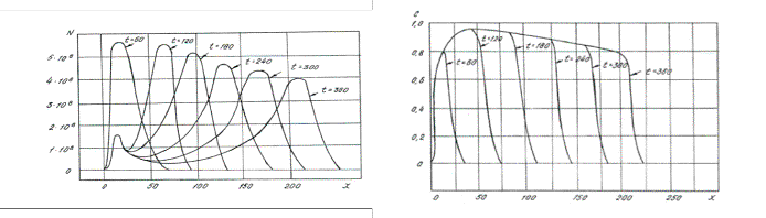 субстрата и метаболита по длине пласта при непрерывном нагнетании культу- ральной жидкости в коллектор.