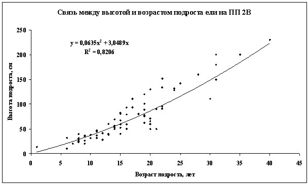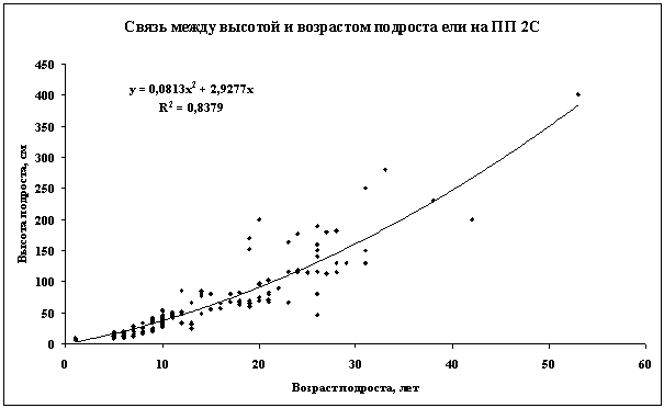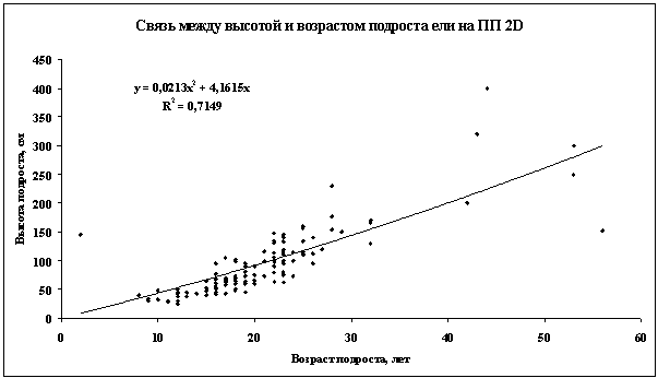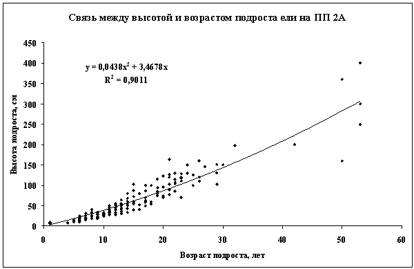 Рис. 1. Связь между высотой и возрастом подроста ели на ПП 2А