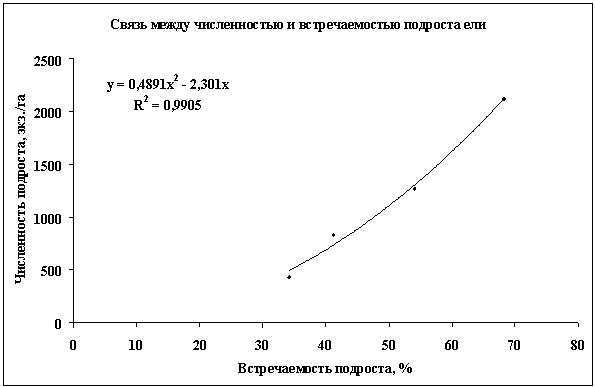 между численностью и встречаемостью подроста может быть выражена степенной [2, 3] или экспоненциальной функцией [8].