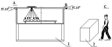 1 – установка ионной имплантации; 2 – блок управления; А, В,С – зоны измерений радиационных