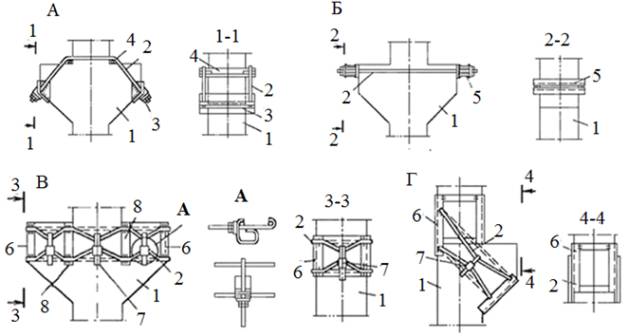 – наклонными тяжами; Б – затяжкой; В – замкнутым хомутом со стягиванием его