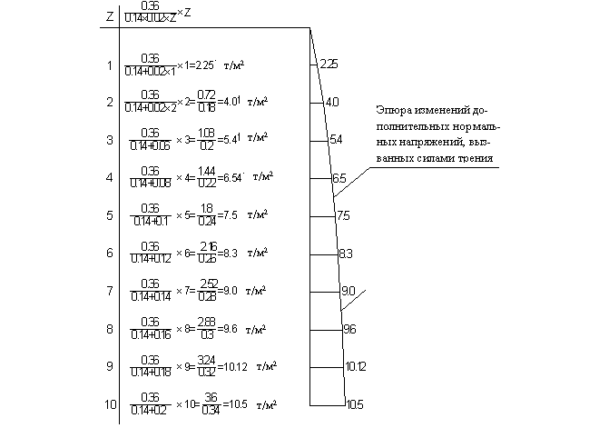 на сваю и величинами нормальных контактных напряжений, дополнительно вызванных