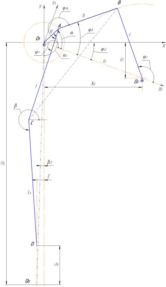 При известном положении шатуна AB координаты точки С присоединения второго шатуна CD определяются длиной f звена АС и углом наклона φf0 звена АС относительно оси шатуна AB. В принятой системе координат X1О1Y1 находится
