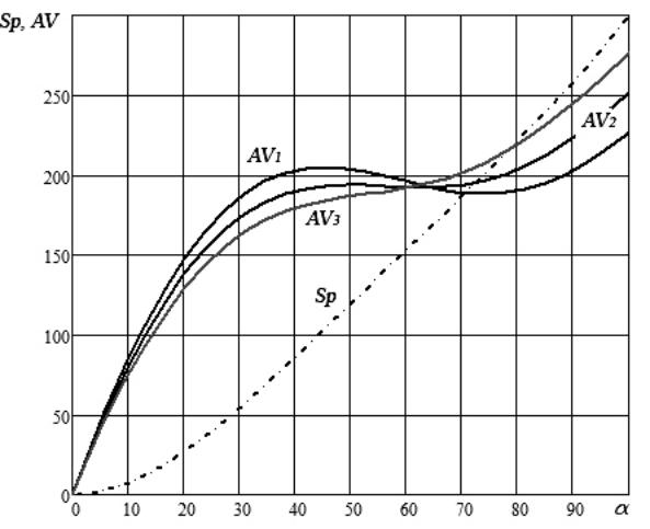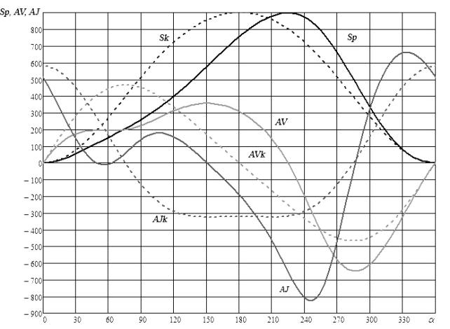Из анализа характера изменения скорости ползуна следует важное преимущество анализируемого механизма. Как известно, существует однозначная взаимосвязь геометрических и силовых характеристик рычажных механизмов [6]. Из условия равенства мгновенной мощности на ведущем и ведомом звене идеального механизма следует, что величина движущего крутящего момента Мкр пропорциональна первой передаточной функции механизма AV и усилию деформации Рд