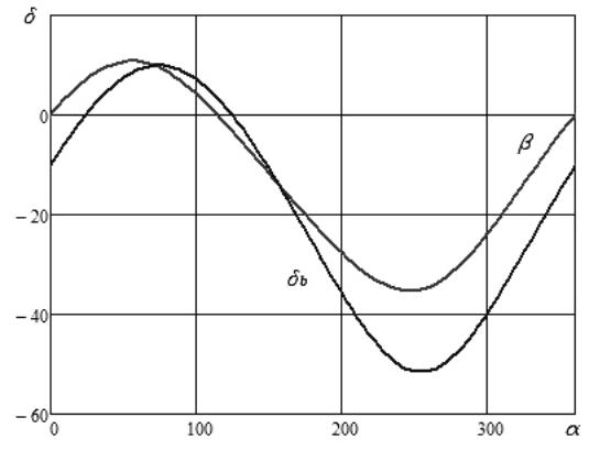 Зависимости углов давления механизма рассматриваемого пресса показаны на рис. 4. Как видно из рисунка величина углов давления не превышает предельные допустимые значения, т. е. работоспособность механизма обеспечивается при любых углах поворота кривошипа.