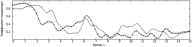 Анализ полученных КФ (рис. 3) показывает, что в течение сопровождения ВО имеются интервалы поворотов ВО относительно линии визирования с повышенной угловой скоростью, которым соответствуют участки с низким КК, а также участки с высоким КК (близким к единице), где ВО практически не вращается. При этом наблюдается повторяемость законов изменения КК.
