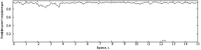 Для сравнения степени индифферентности структуры ДП, полученных на разной частоте, последовательно рассчитывался КК между ДП, полученными по сигналам разных РЛС в одинаковые моменты времени (рис. 6), и строилась корреляционная характеристика. Вариант такой характеристики, соответствующей отражениям от ВО типа А-319, изображен на рис. 6. Незначительное снижение КК ДП лайнера А-319 до 0,829 в промежутке от 2 до 4 с относительно начала наблюдения можно объяснить вхождением ВО в область турбулентности и усложнением характера вращения планера ВО относительно линии визирования.