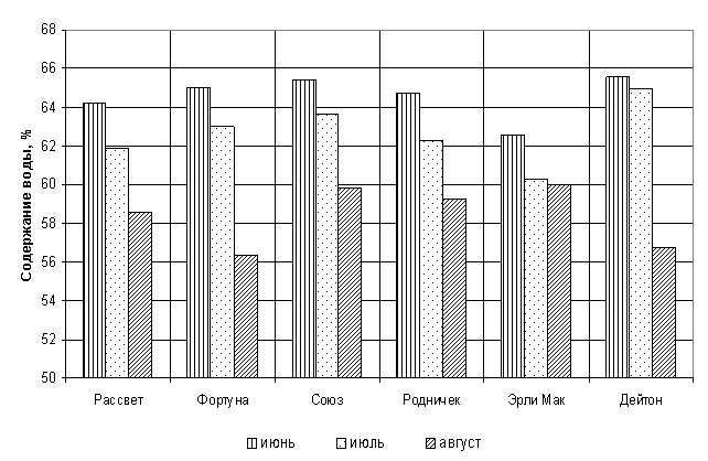 июне характеризовались сорта Фортуна. Союз, Родничок и Дейтон (64,7 – 65,6 %),