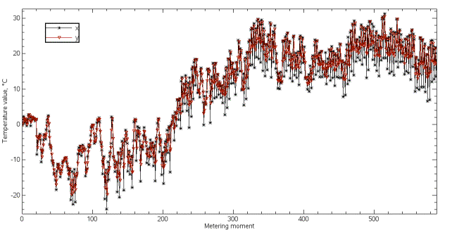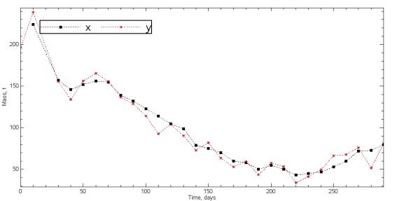 Pic. 2. Practical (x) and forecast (y) values of caught